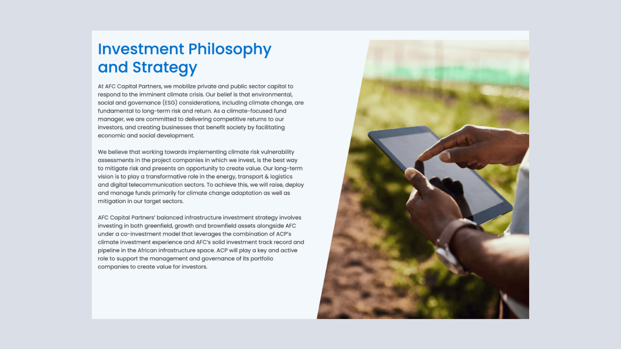 AFC Capital Partners is the 100% owned Asset Management Subsidiary of AFC, created to mobilize and manage third party funds to unlock new sources of capital to fund the African infrastructure investment gap – estimated at US$170 billion.