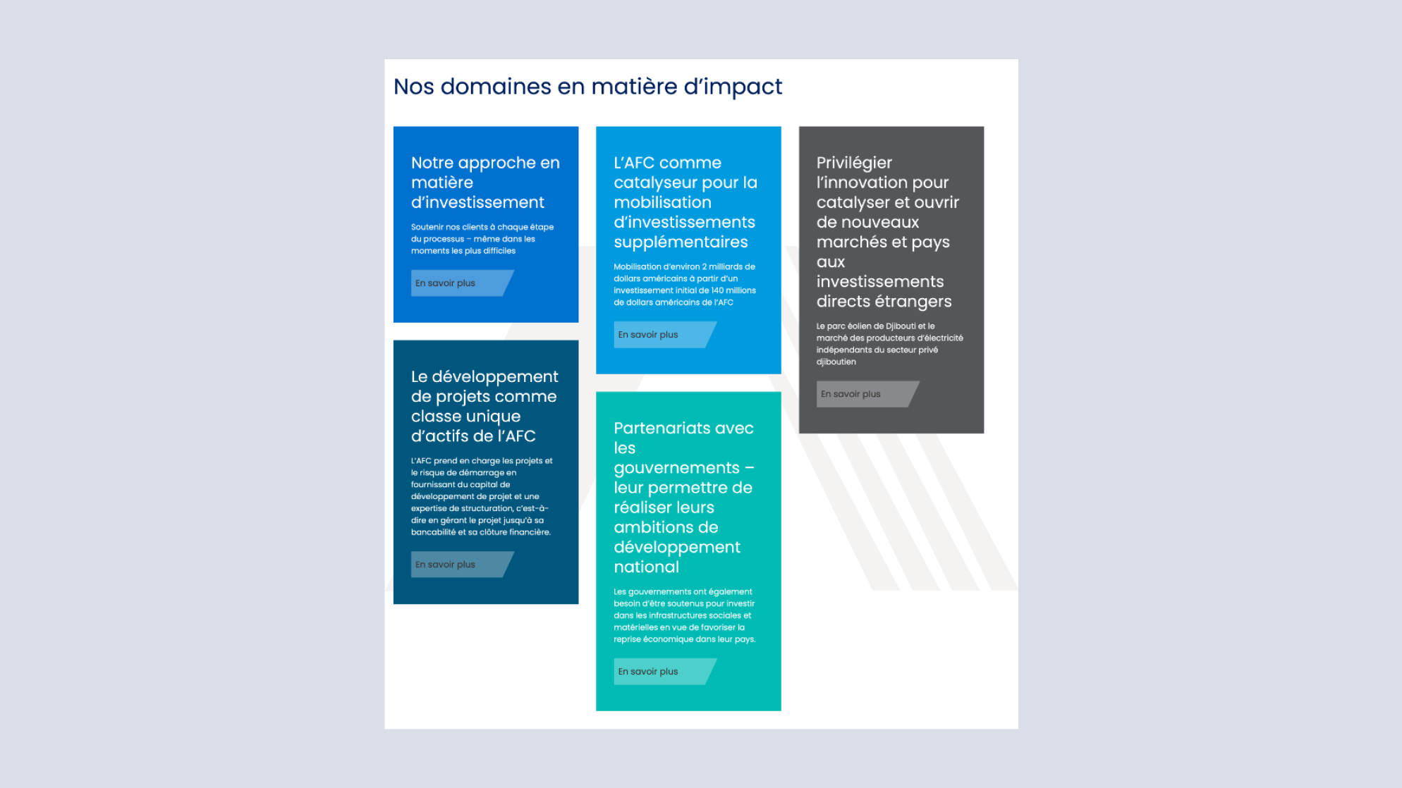 Développer un site web simple et compréhensible qui couvrira tous les aspects de la Société financière africaine en anglais, français, espagnol et portugais.