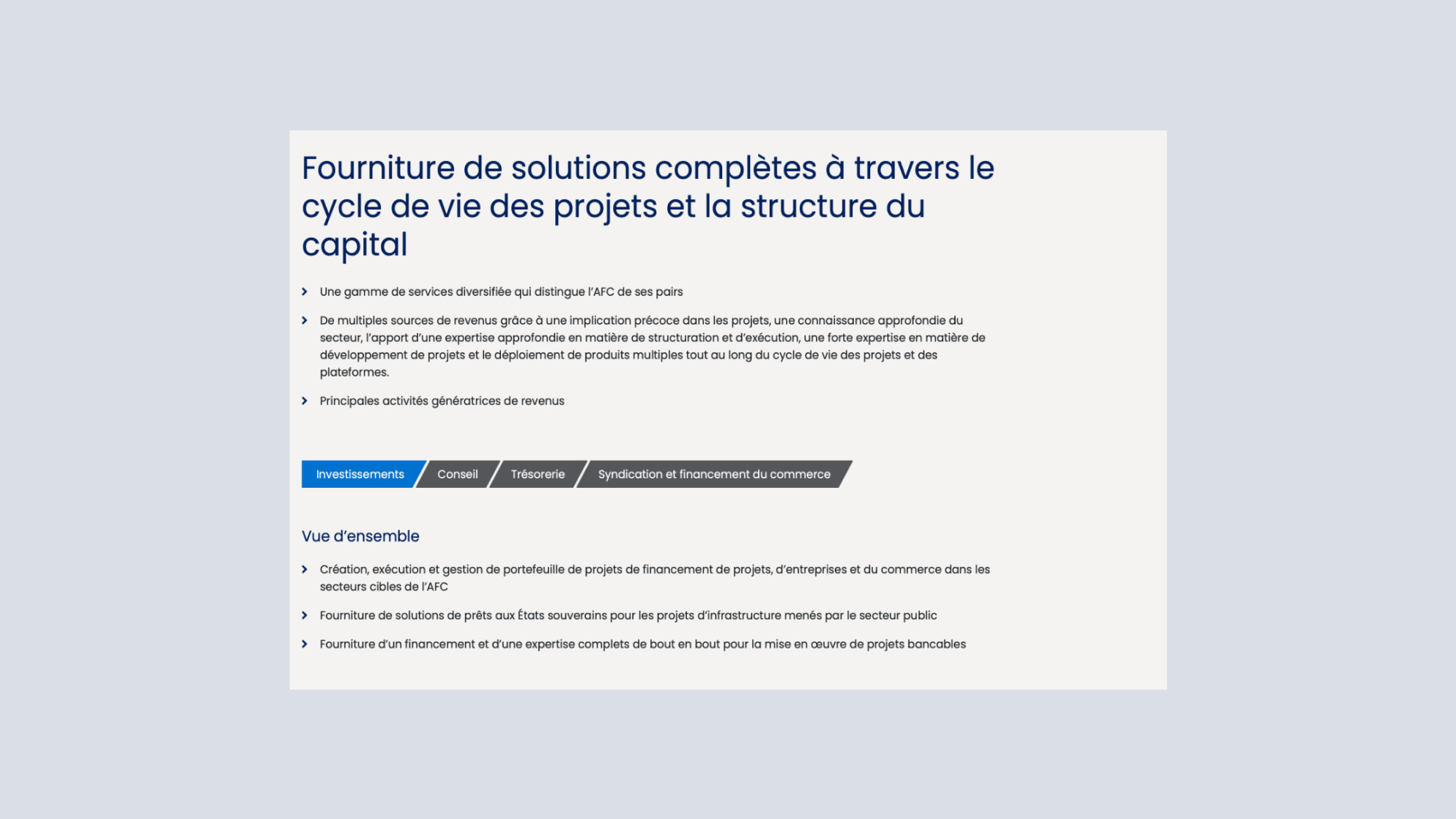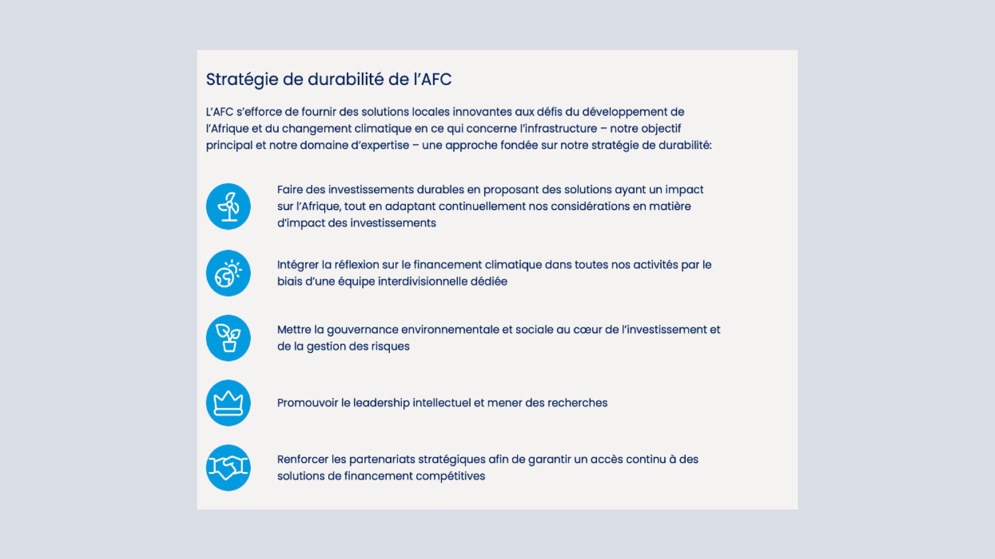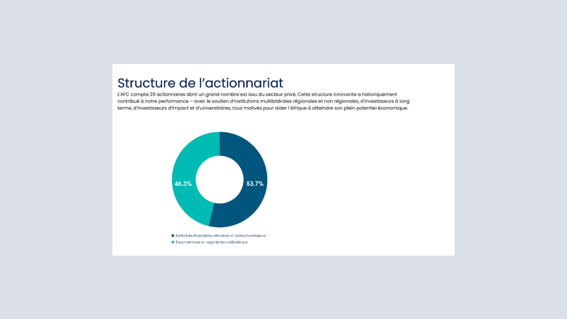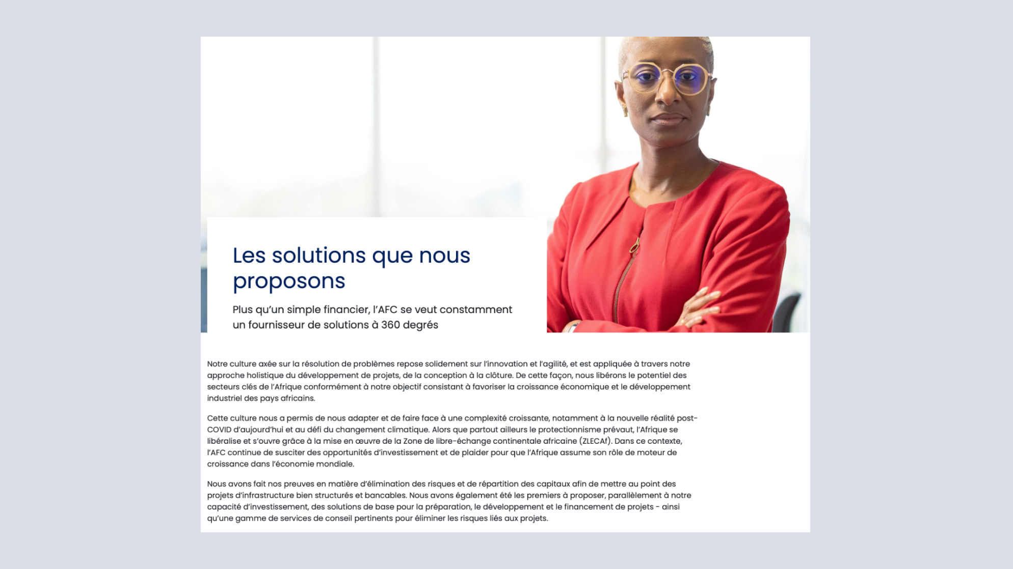 L'AFC est une institution financière multilatérale, créée par des États souverains africains pour apporter des solutions pragmatiques au déficit d'infrastructures et à l'environnement opérationnel difficile de l'Afrique.